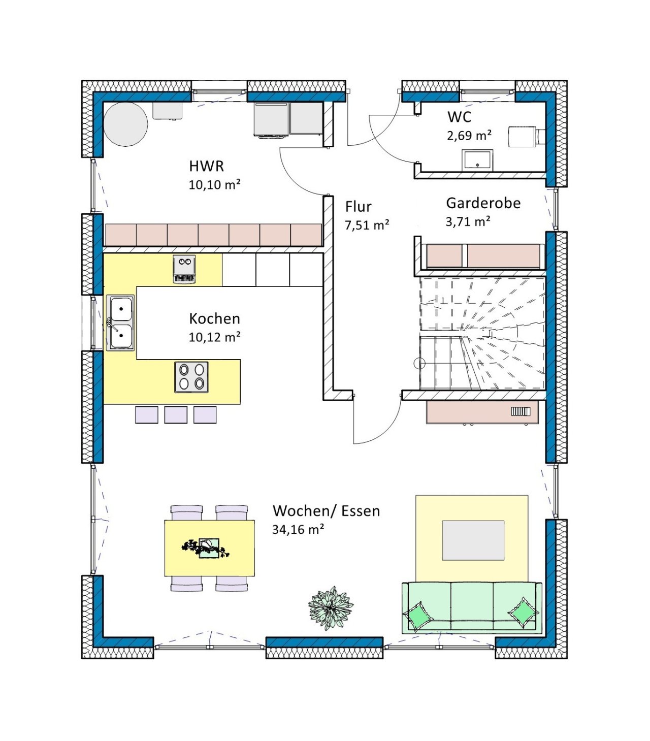 Die Aufteilung der Räume ist optimal, trotzdem können Veränderungen nach Ihren Vorstellungen und Wünschen berücksichtigt werden. Solange die äußeren Abmessungen gleich bleiben, entstehen dadurch keinerlei Mehrkosten.